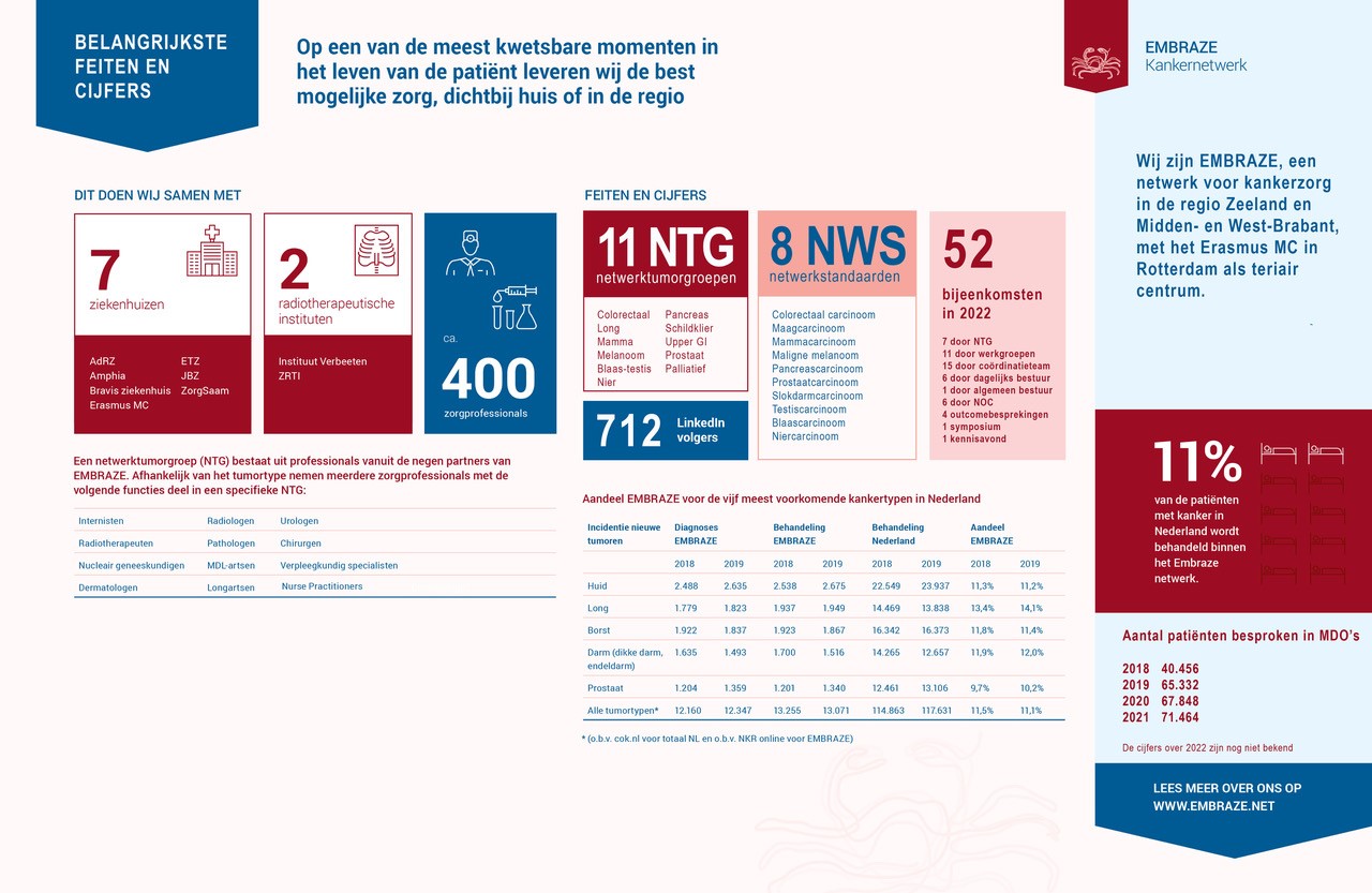 Prestigieuze prijzen onderzoek communicatiegedrag in medische teams Organisatiepsycholoog Margo Janssens wint prijzen met onderzoek naar communicatiegedrag in medische teams. Save the date: Gelijke borstkankerzorg voor iedereen Dinsdag 26 september vindt van 14.00 tot 17.30 uur de bijeenkomst 'Gelijke borstkankerzorg voor iedereen' plaats. Symposium Regionale multidisciplinaire samenwerking bij gevorderde huidkanker 3e symposium regionale multidisciplinaire samenwerking bij gevorderde huidkanker op woensdag 4 oktober Digitaal dashboard geeft inzicht in onnodige zorg rond levenseinde Amphia maakt met een digitaal dashboard inzichtelijk welke hoogintensieve zorg mensen kanker kort voor hun overlijden nog krijgen. EMBRAZE in feiten en cijfers In één beeld hebben we de belangrijkste feiten en cijfers van EMBRAZE gevangen. De juiste zorg op de juiste plaats voor patiënten met een sarcoom Het Erasmus MC is een pilot gestart voor patiënten met sarcoom of een verdenking daarvan. Hans Westgeest volgt Cees Rodenburg op als medisch coördinator EMBRAZE – interview Op 1 januari dit jaar volgde Hans Westgeest (l) Cees Rodenburg op als medisch coördinator bij EMBRAZE. Lees hier het duo-interview met beide internist-oncologen. ZRTI neemt hypermodern bestralingstoestel in gebruik voor patiënten met prostaatkanker Op 24 april 2023 behandelde het Zuidwest Radiotherapeutisch Instituut (ZRTI) in Vlissingen zijn eerste patiënt op het nieuwe bestralingstoestel de Ethos. Minister Ernst Kuipers daagt oncologienetwerken EMBRAZE en Concord uit Minister Ernst Kuipers sprak op 13 april zo'n 140 professionals toe tijdens de beleidstafel van de oncologienetwerken EMBRAZE en Concord in het Amphia in Breda. Beleidstafel ‘IZA, Netwerkzorg en MDO: een uitdaging’ Het oncologisch netwerk Zuidwest Nederland organiseert op donderdag 13 april een beleidstafel over ‘IZA, Netwerkzorg en MDO: een uitdaging’. Deze bijeenkomst is een initiatief van... Relinde Weil nieuwe voorzitter raad van bestuur Jeroen Bosch Ziekenhuis Relinde Weil wordt met ingang van 11 april benoemd als voorzitter van de raad van bestuur van het Jeroen Bosch Ziekenhuis. Optimale doseerstrategie bij immunotherapie Hoe komen we tot de meest optimale doseerstrategie bij dure immunotherapie? 1.34510.19